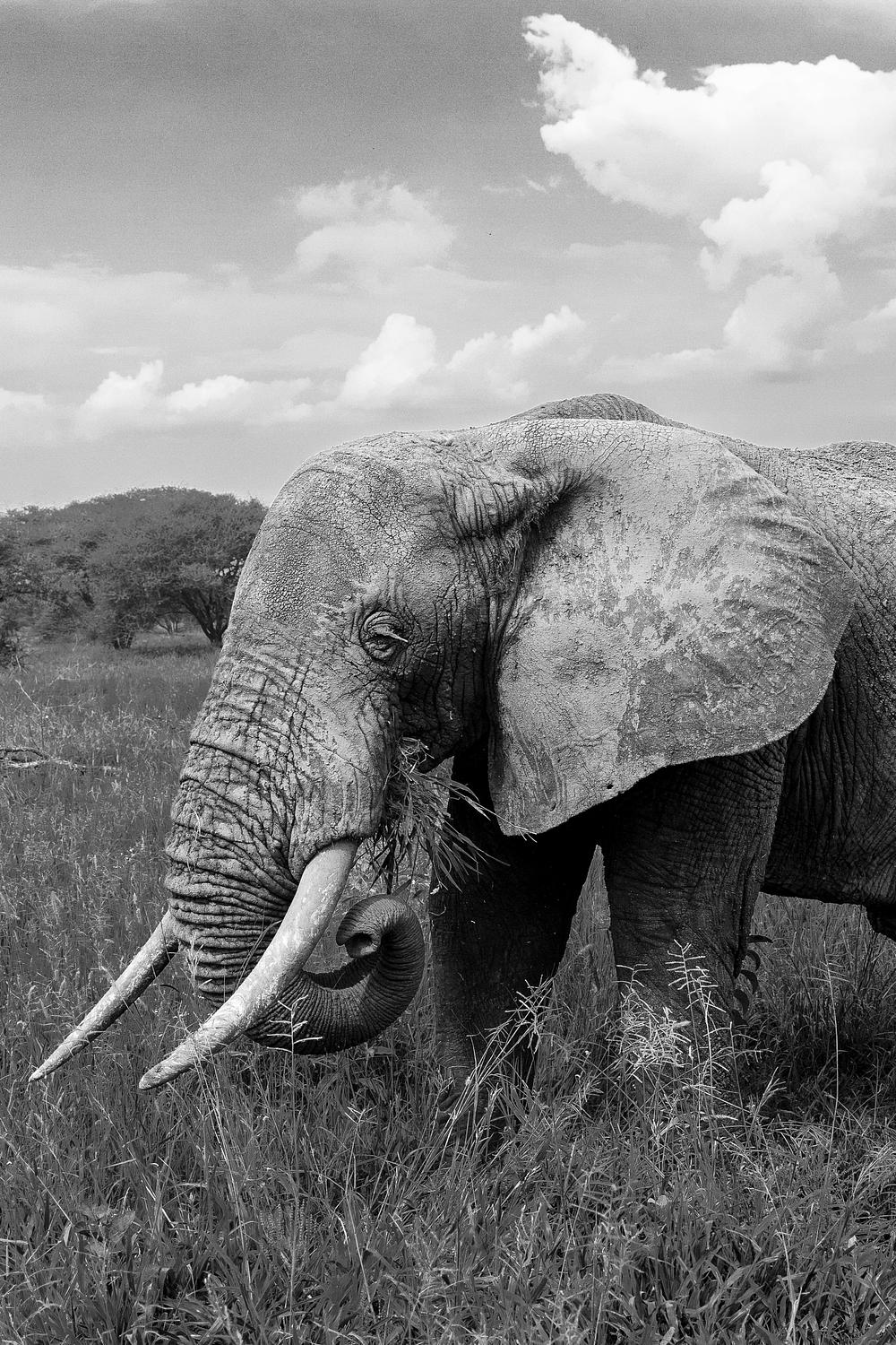 The textures of this elephant's skin really stands out in black and white. She's looking like a true wise old queen.